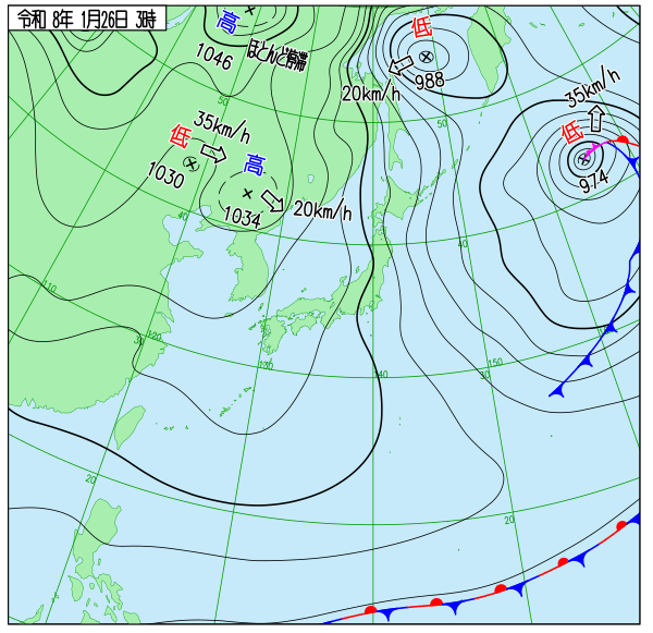 • 日本の東海上:974hPaの非常に発達した低気圧が時速35kmで北上しており、北日本を中心に強い風や雪の影響が残っていると考えられます。