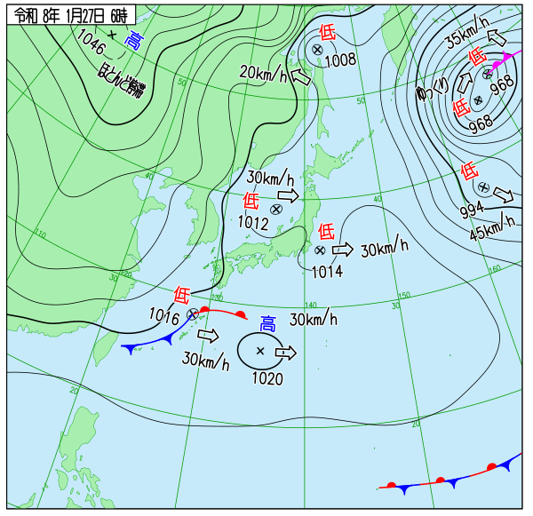 - 巨大な低気圧の北上アリューシャン近海には、968hPaという非常に発達した二つの中心を持つ巨大な低気圧があり、北へ進んでいます。日本付近への直接的な影響は少なくなっていますが、北日本の海上では依然として波が高い可能性があります。