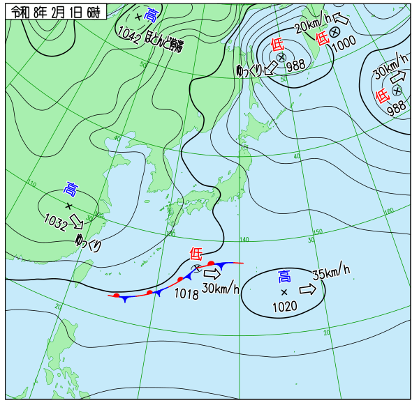オホーツク海にある988hPaの低気圧が「ゆっくり」と南下しており、北日本付近では依然として等圧線が立て込んでいます。 - 日本の南にある前線と低気圧