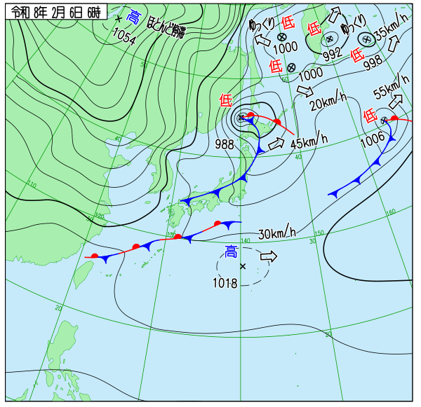 - 日本海の発達した低気圧(988hPa)能登沖付近にある中心気圧988hPaの低気圧が、時速45kmという速いスピードで北東へ進んでいます。