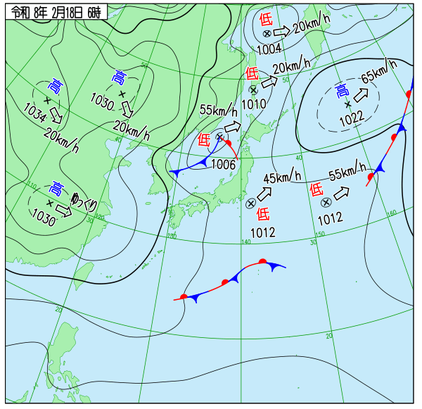 - 日本海に中心気圧 1006hPa の低気圧があり、寒冷前線を伴って 時速55km で東へ進んでいます。
