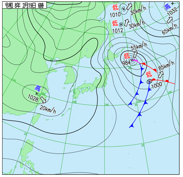 - この低気圧からは閉塞前線(紫色の線)が伸びており、発達のピークを迎えていることを示しています。
