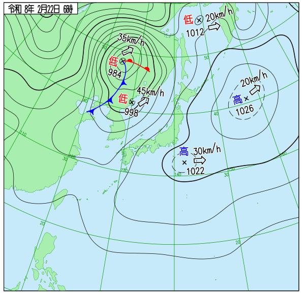 - 日本海(北緯45度、東経135度付近)に中心気圧 984hPa の発達した低気圧があり、時速35km で北東へ進んでいます。