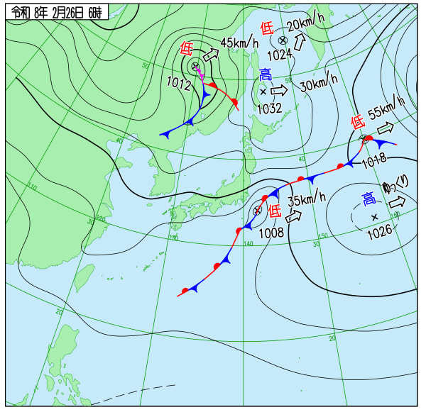 - サハリン付近(北緯50度付近)に 1024hPa の低気圧があり、時速20km で北東へ進んでいます。