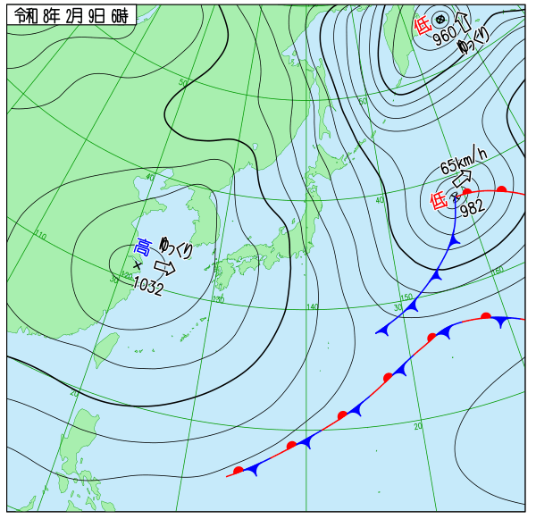 • 寒冷・温暖前線: 982hPaの低気圧から、南西方向へ寒冷前線、南東方向へ温暖前線が伸びています。