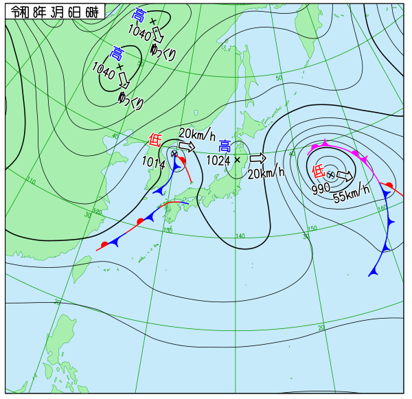 今日の天気(2026年(令和8年)3月6日午前6時) 未分類 2026.03.08 出典:気象庁ホームページ (https://www.data.jma.go.jp/yoho/wxchart/quickmonthly.html)